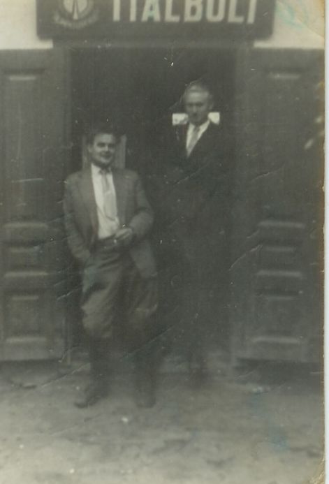 Bíró Géza és Ritzeld Rezső a Ritzeld kocsma ajtajában 1962-ben.
